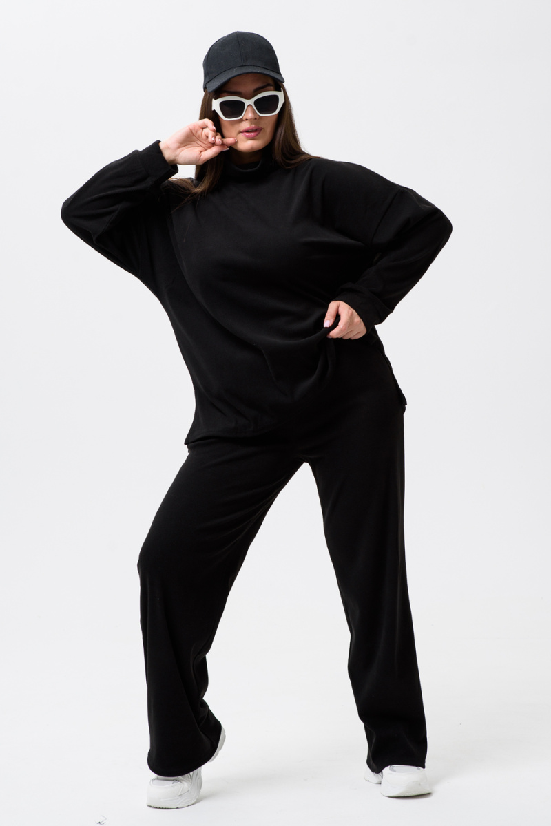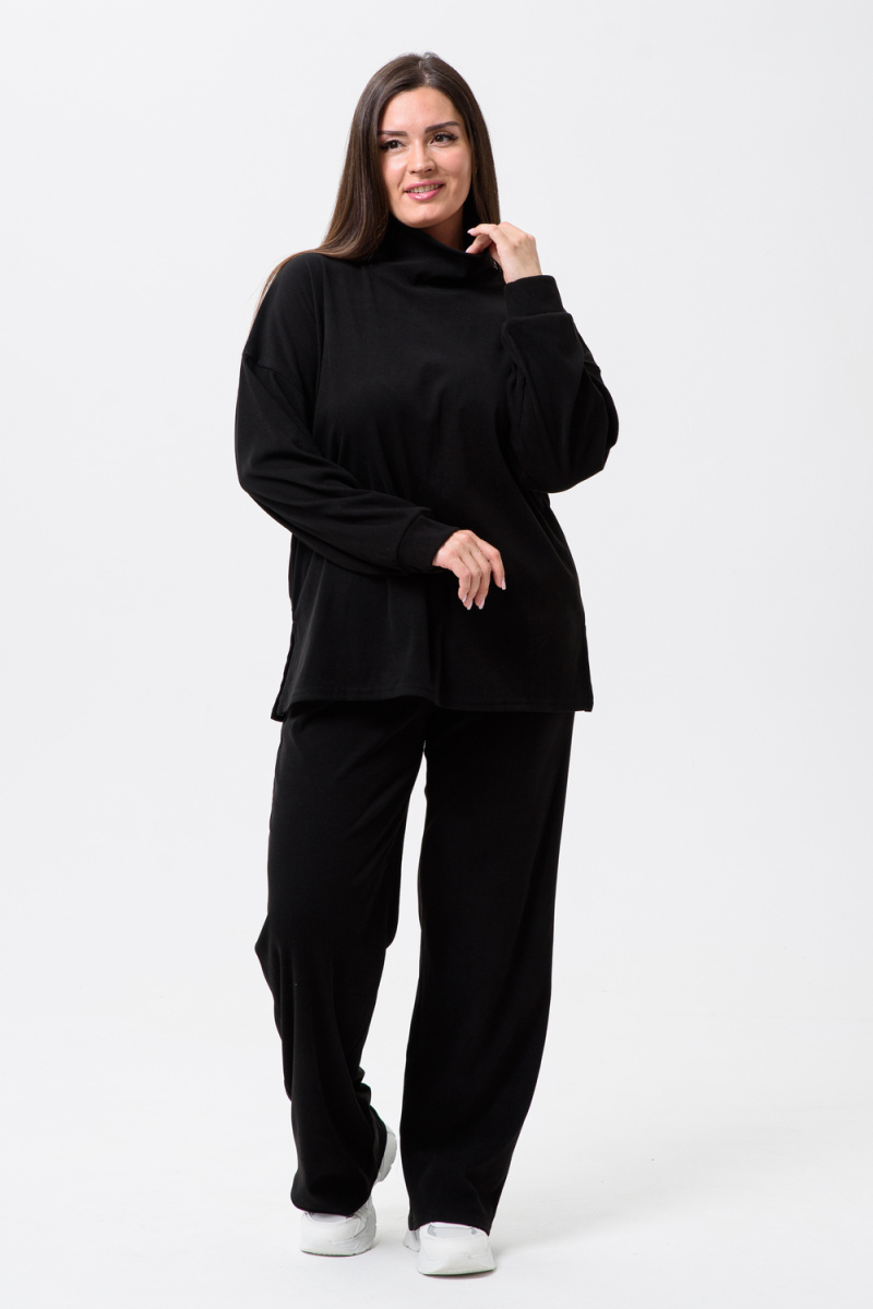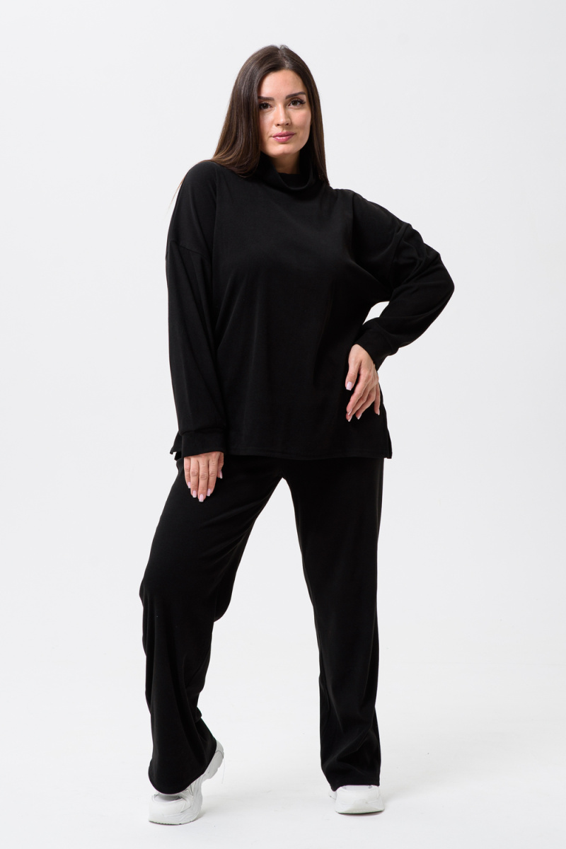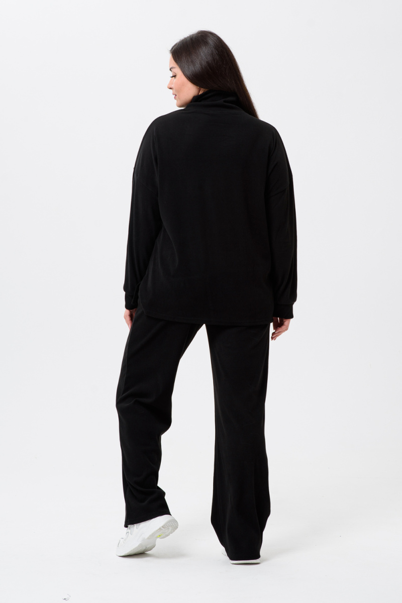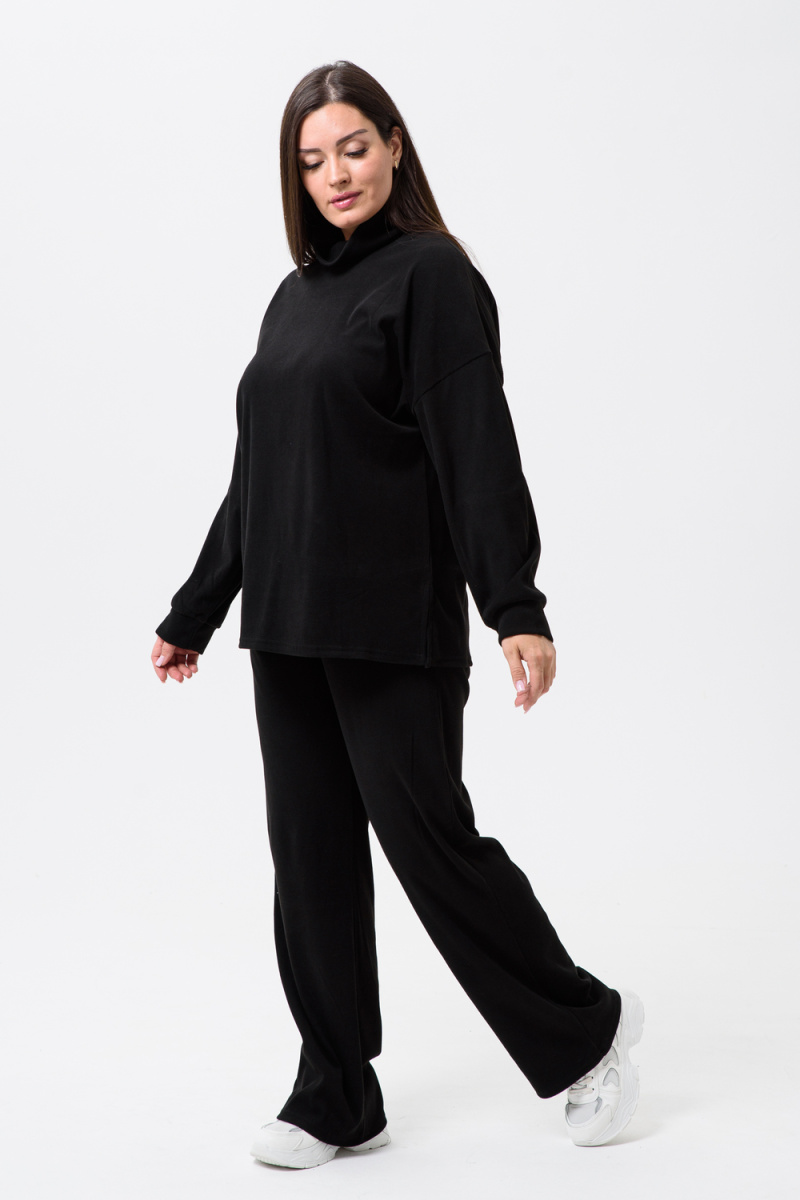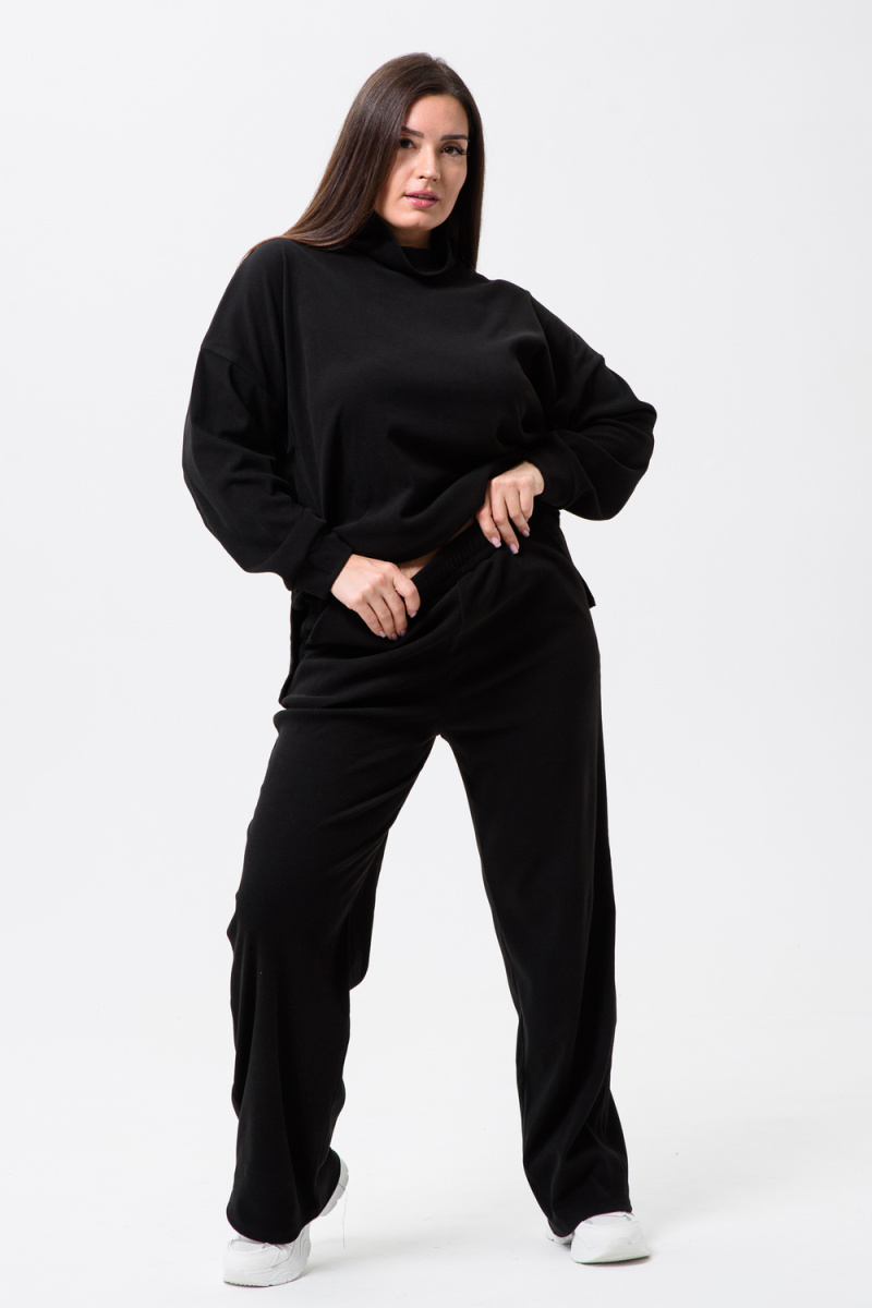 Женский костюм - двойка, выполнен из утепленной, мягкой, рельефной ткани. Верх - кофта, достаточно свободного кроя, рукав спущенный на манжете, горловина высокая, также можно носить раздельно от штанов, хорошо будет сочетаться с джинсами или с классическими брюками. Низ - свободные штаны палаццо, пояс на резинке, по бокам карманы. Костюм прекрасно подойдет для прогулок и работы, хорошо в прохладную погоду с жилеткой или пальто, идеально для вашего гардероба.
