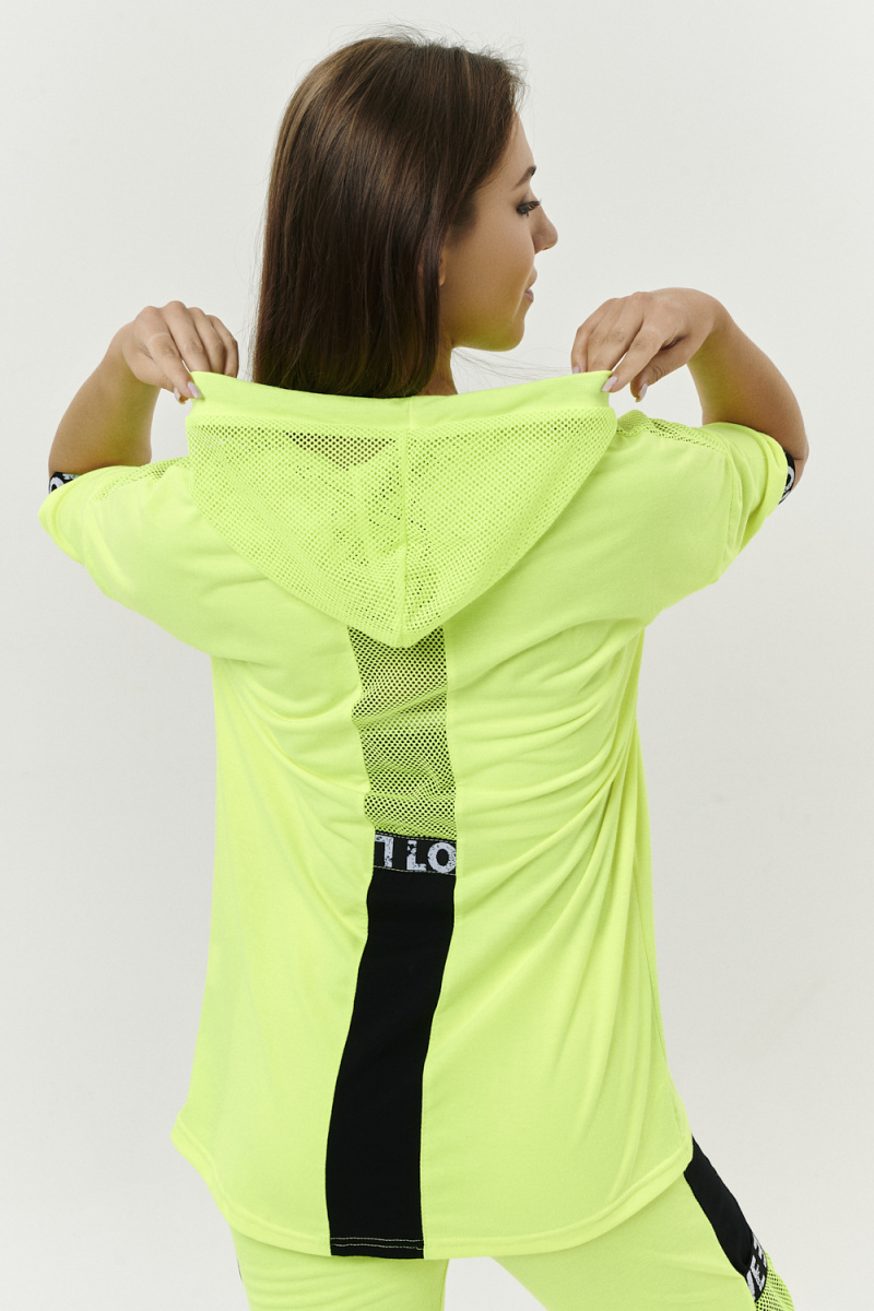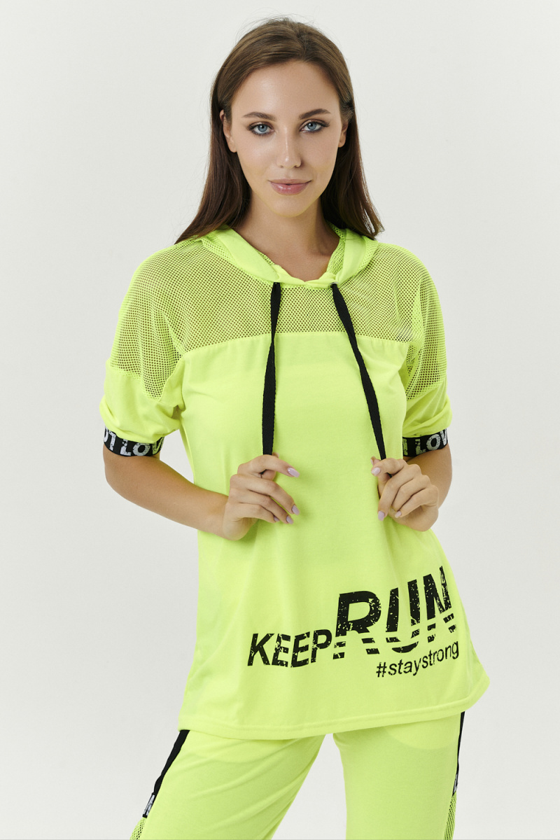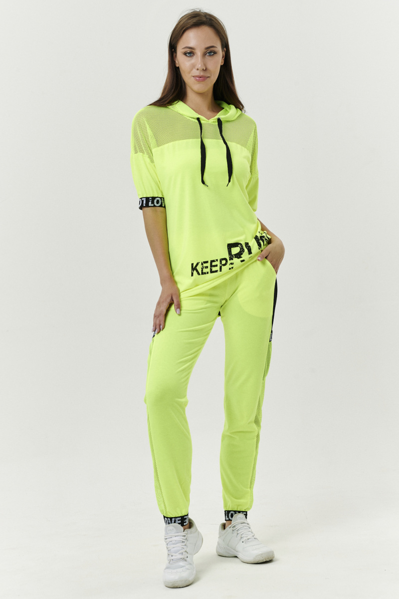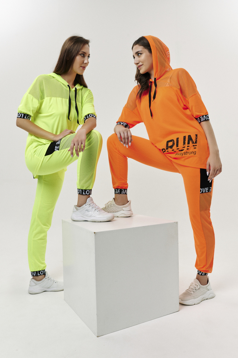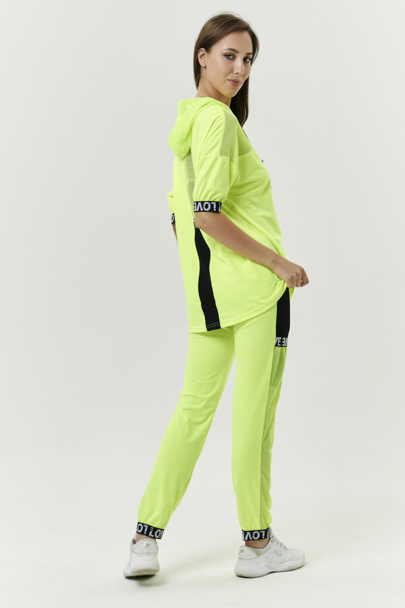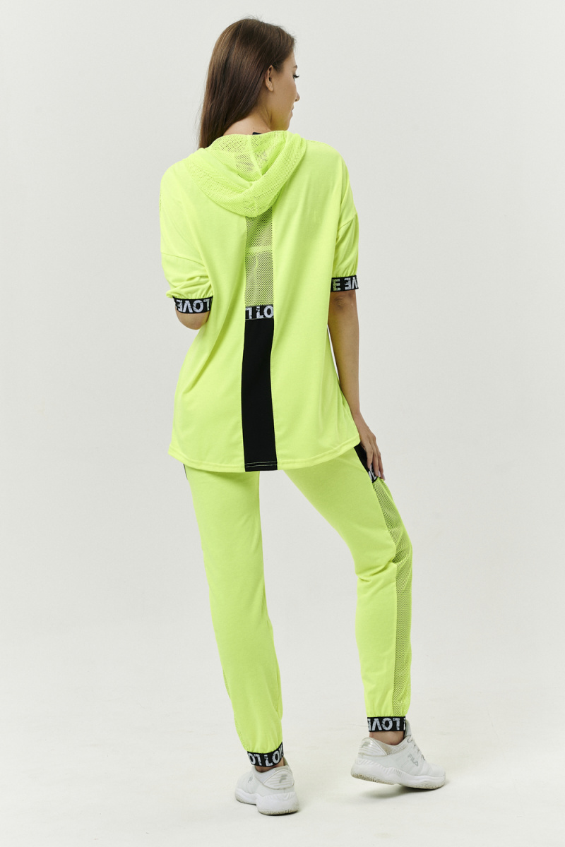 Костюм состоит из туники и брюк. Туника прямая, свободная, с капюшоном из сетки, с удлиненной спинкой. Рукав короткий, обработанный декоративной резинкой. Кокетка полочки выполнена из сетки. Вдоль центра спинки расположена декоративная вставка из отделочного полотна и сетки. Брюки свободные, длинные, с карманами, на эластичном поясе. Низ брюк обработан декоративной резинкой. Вдоль боковых швов расположен лампас из отделочного полотна и сетки. В средней части лампаса расположен карман.