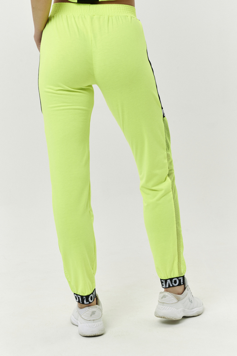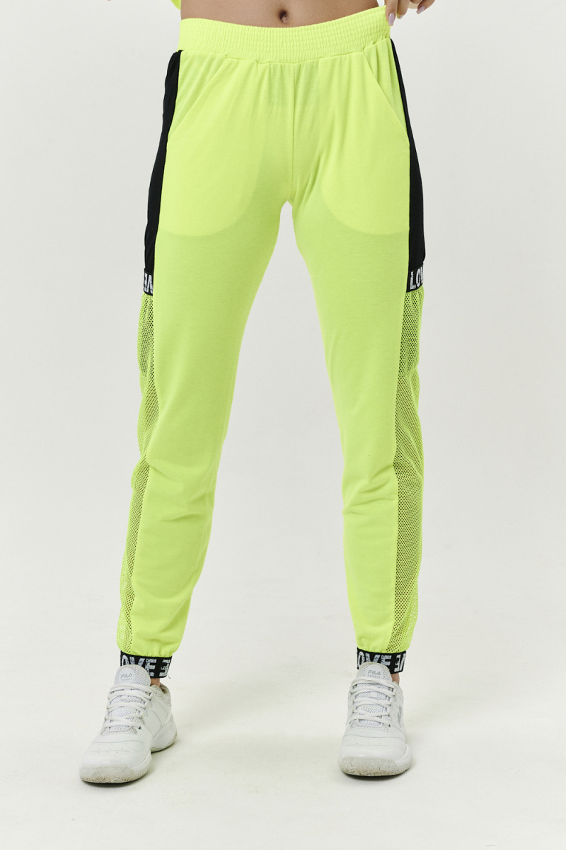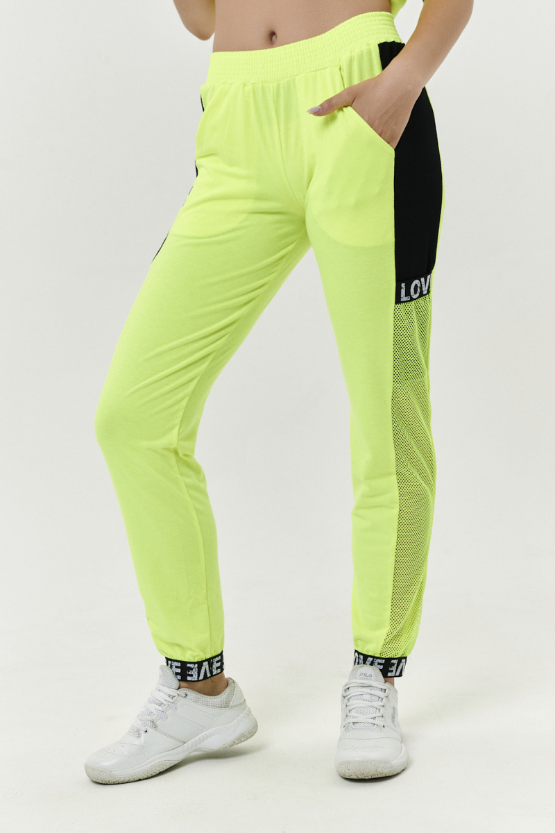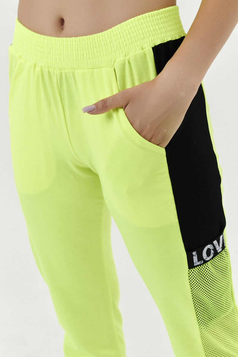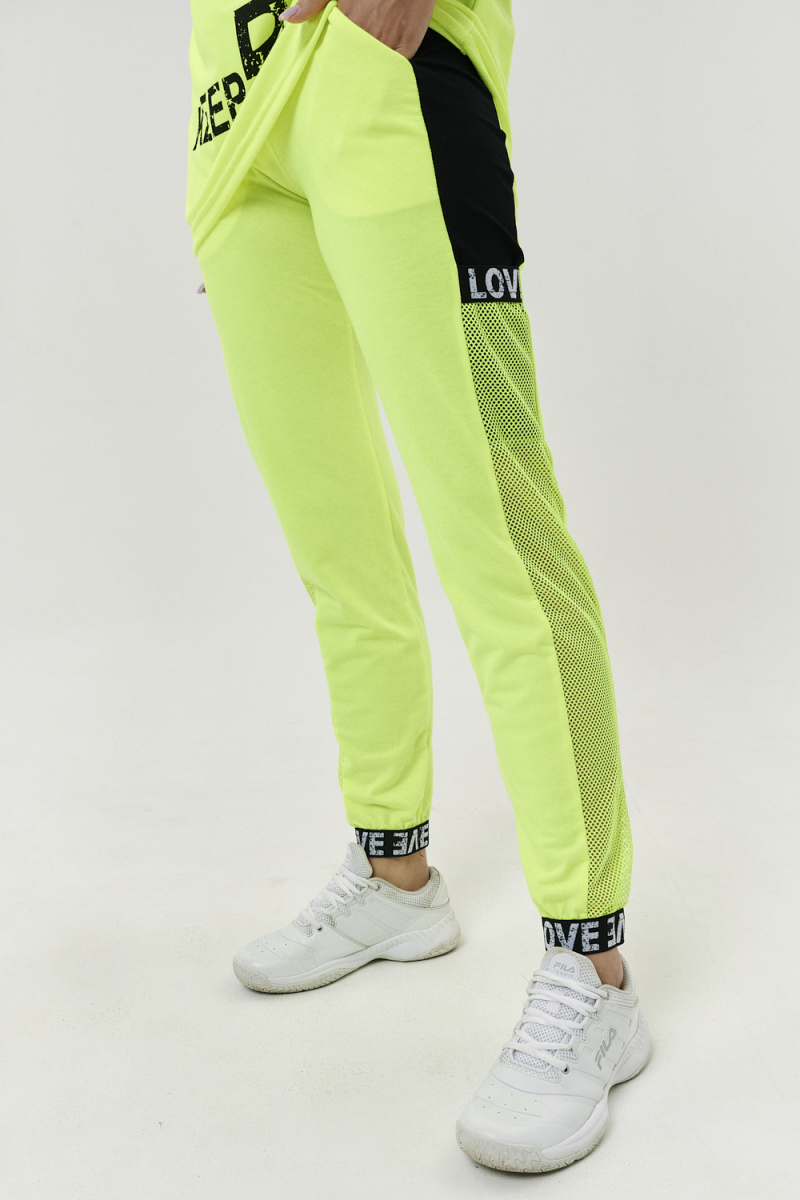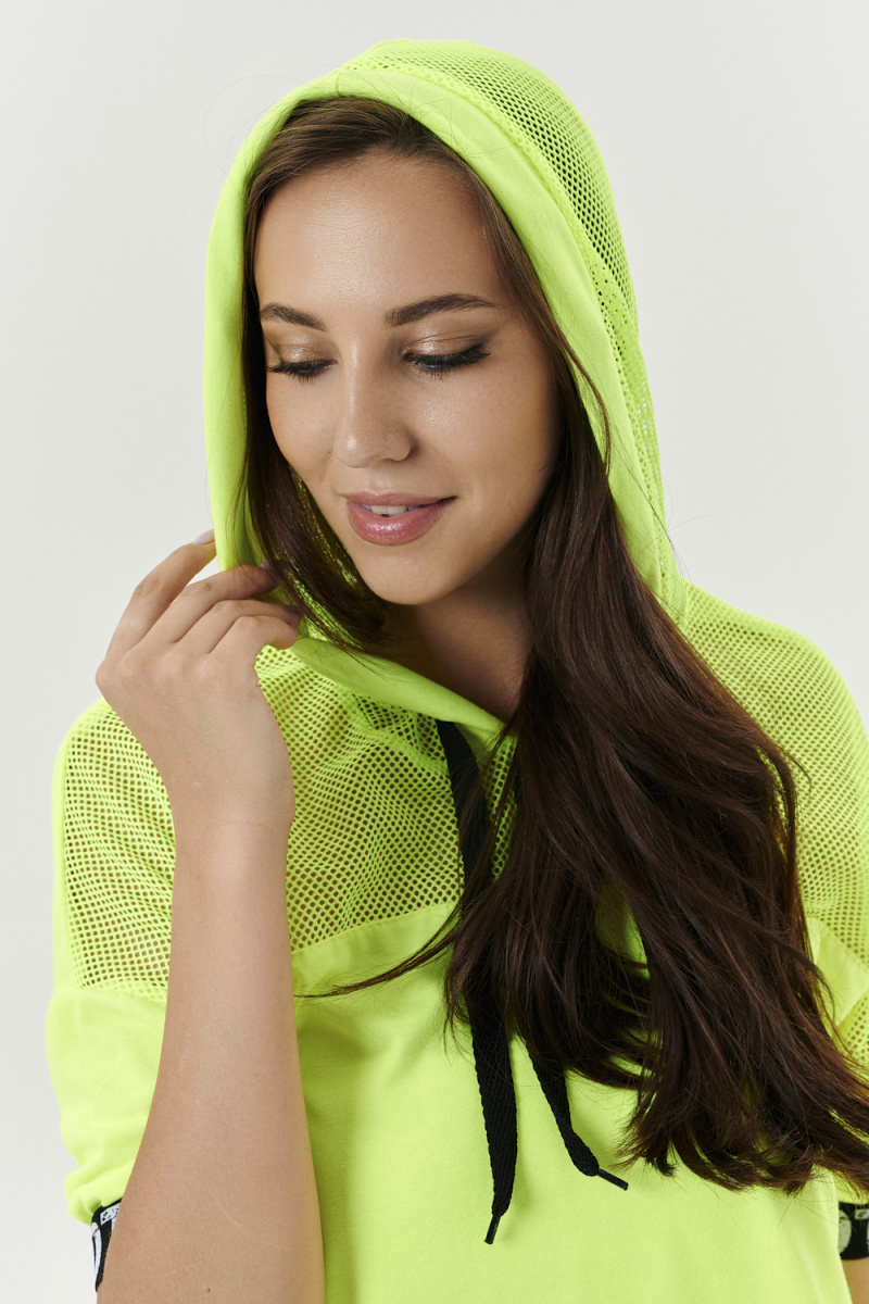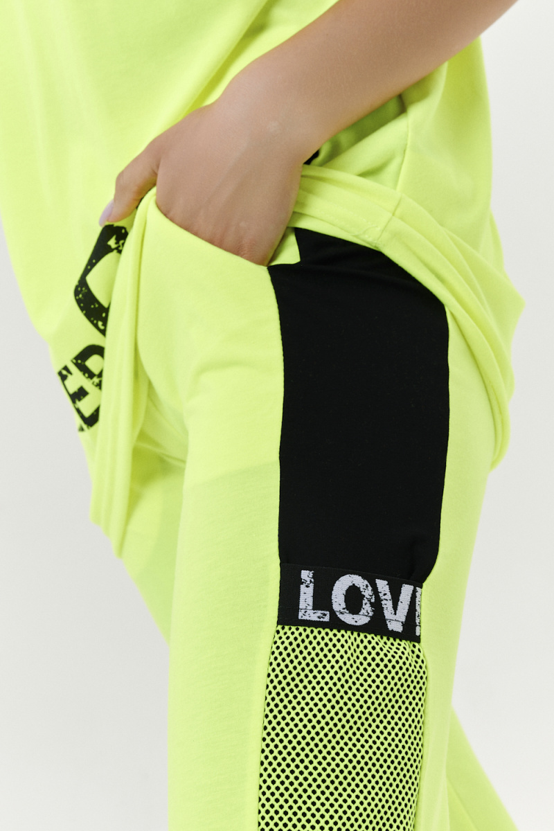 Костюм состоит из туники и брюк. Туника прямая, свободная, с капюшоном из сетки, с удлиненной спинкой. Рукав короткий, обработанный декоративной резинкой. Кокетка полочки выполнена из сетки. Вдоль центра спинки расположена декоративная вставка из отделочного полотна и сетки. Брюки свободные, длинные, с карманами, на эластичном поясе. Низ брюк обработан декоративной резинкой. Вдоль боковых швов расположен лампас из отделочного полотна и сетки. В средней части лампаса расположен карман.